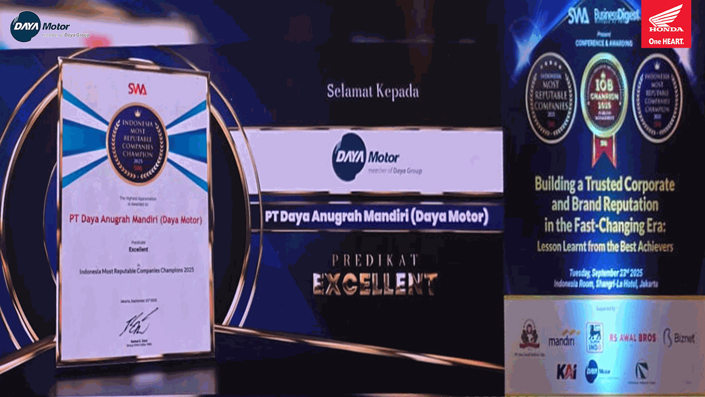 Dengan diraihnya penghargaan Indonesia Most Reputable Companies Champion 2025, Daya Motor semakin mantap melangkah sebagai jaringan dealer Honda terpercaya. Tidak hanya menghadirkan produk unggulan, tetapi juga memberikan pengalaman layanan terbaik yang berkesan di hati pelanggan. Sejalan dengan visinya, Daya Motor berkomitmen menjadi jaringan layanan purna jual sepeda motor Honda terbaik di Indonesia, serta terus menjadikan setiap pelanggan sebagai customer for life.
